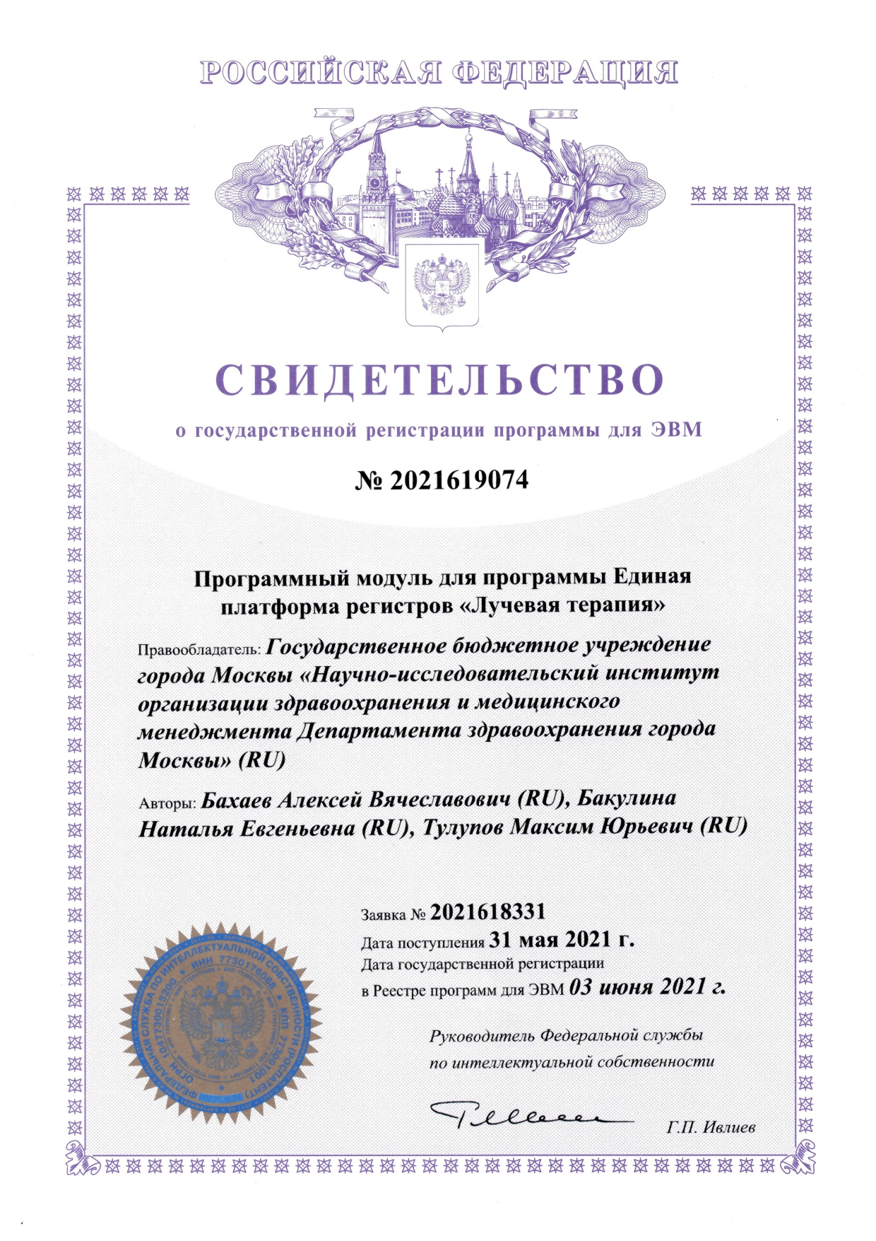 | 2 | Программный модуль для программы Единая платформа регистров «Лучевая терапия» | ПЭВМ | 2021619074 | 03.06.2021 |