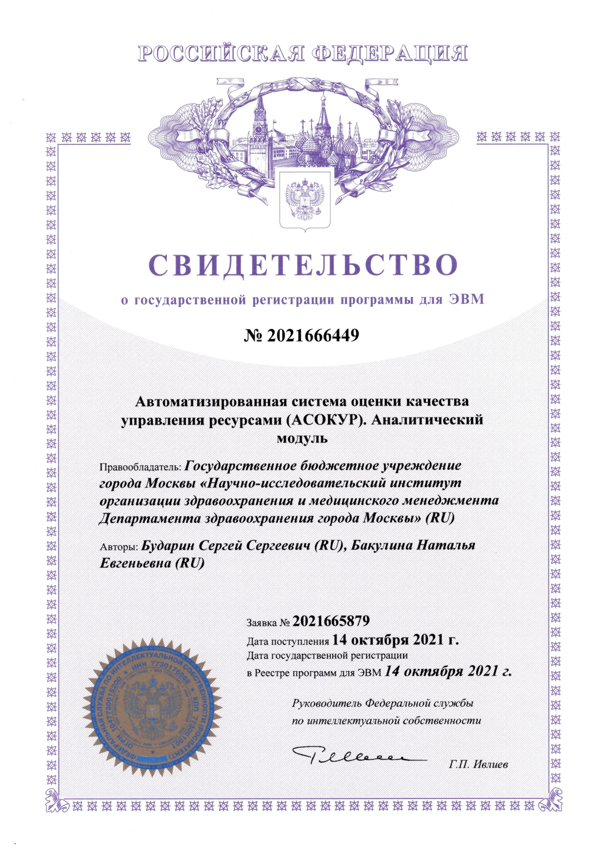 | 32 | Автоматизированная система оценки качества управления ресурсами (АСОКУР). Аналитический модуль | ПЭВМ | 2021666449 | 14.10.2021 |