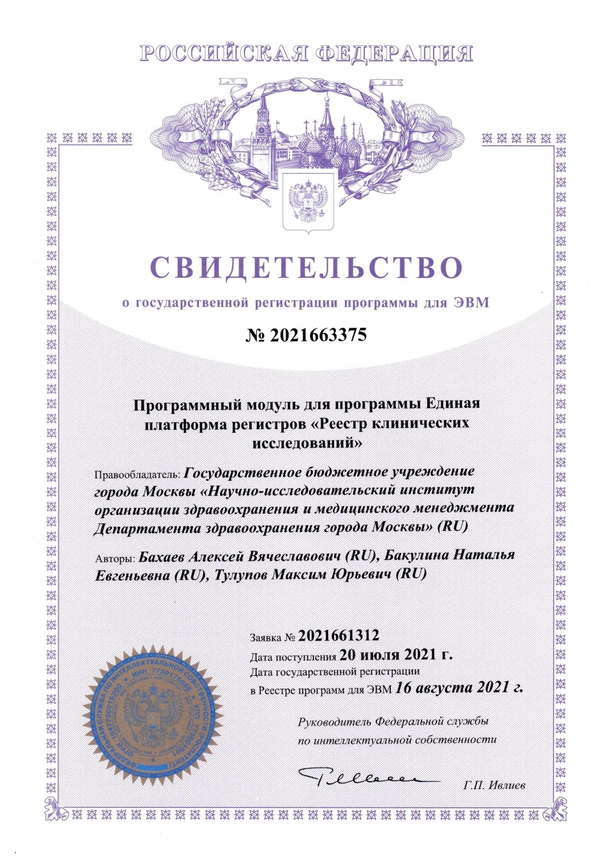 | 26 | Программный модуль для программы Единая платформа регистров «Реестр клинических исследований» | ПЭВМ | 2021663375 | 16.08.2021 |