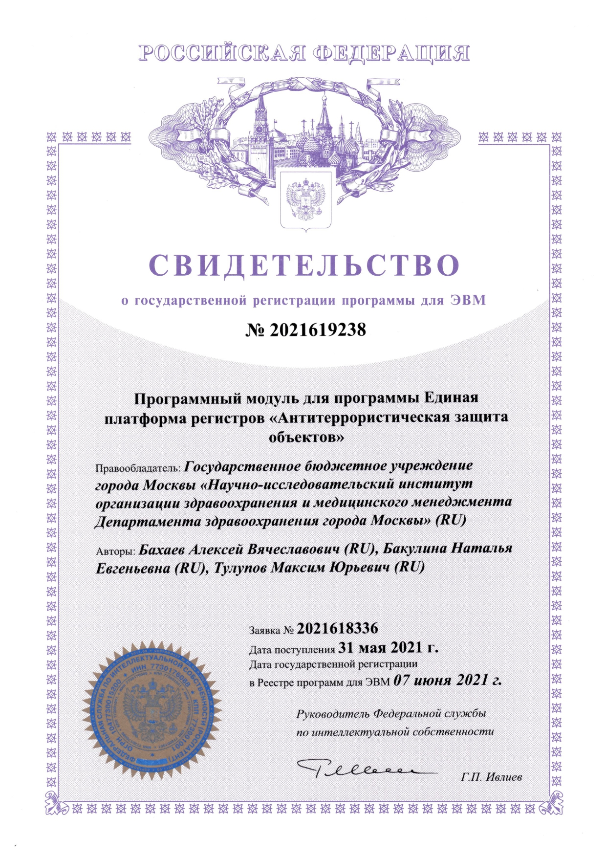 | 7 | Программный модуль для программы Единая платформа регистров «Антитеррористическая защита обьектов» | ПЭВМ | 2021619238 | 07.06.2021 |