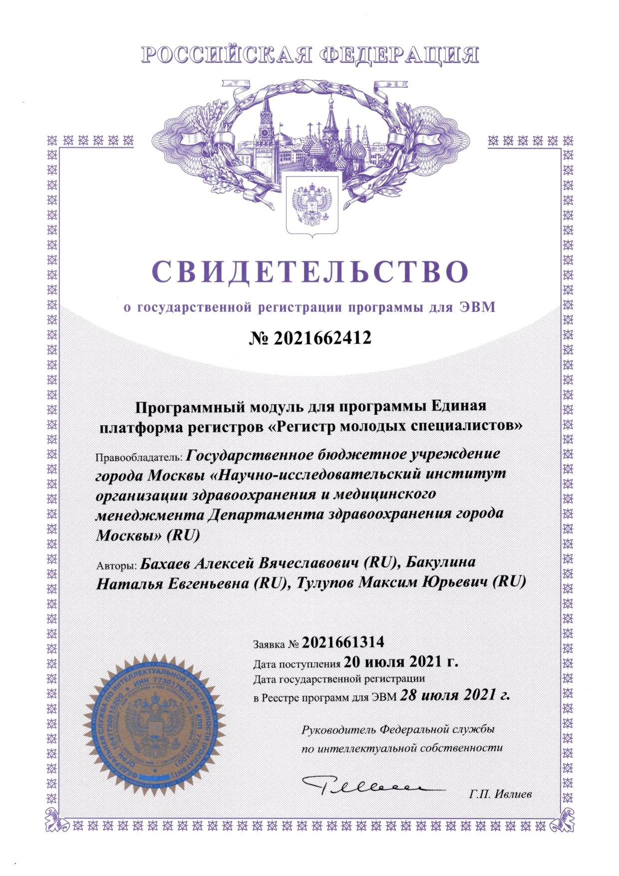 | 21 | Программный модуль для программы Единая платформа регистров «Регистр молодых специалистов» | ПЭВМ | 2021662412 | 28.07.2021 |