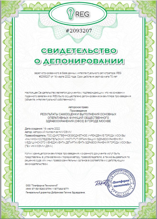 | 45 | Результаты самооценки выполнения основных оперативных функций общественного здравоохранения (ОФОЗ) в городе Москве на основе методологии Европейского регионального бюро Всемирной организации здравоохранения | Произведение науки | 2093207 | 16.03.2022 |