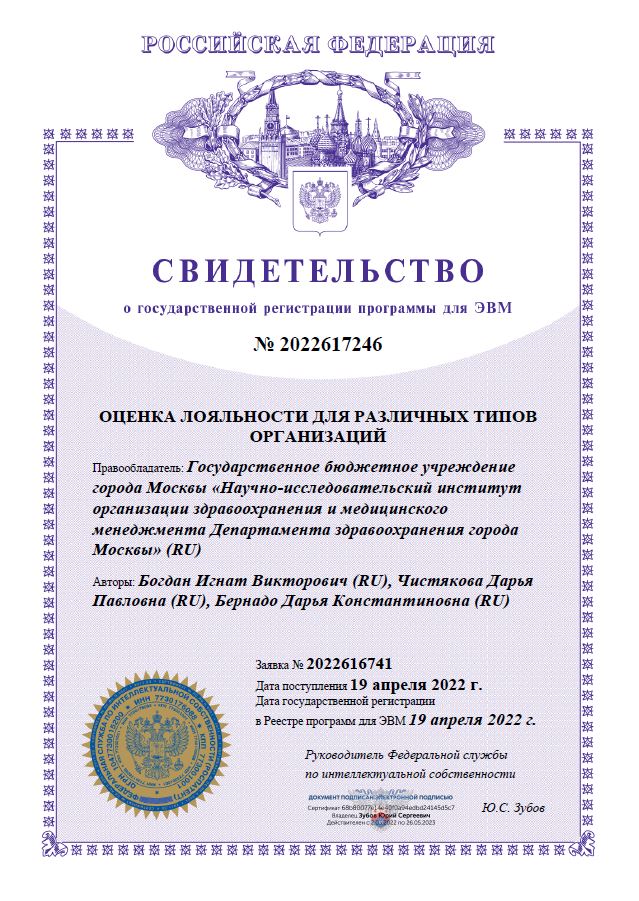 | 47 | Оценка лояльности для различных типов организаций | ПЭВМ | 2022617246 | 19.04.2022 |