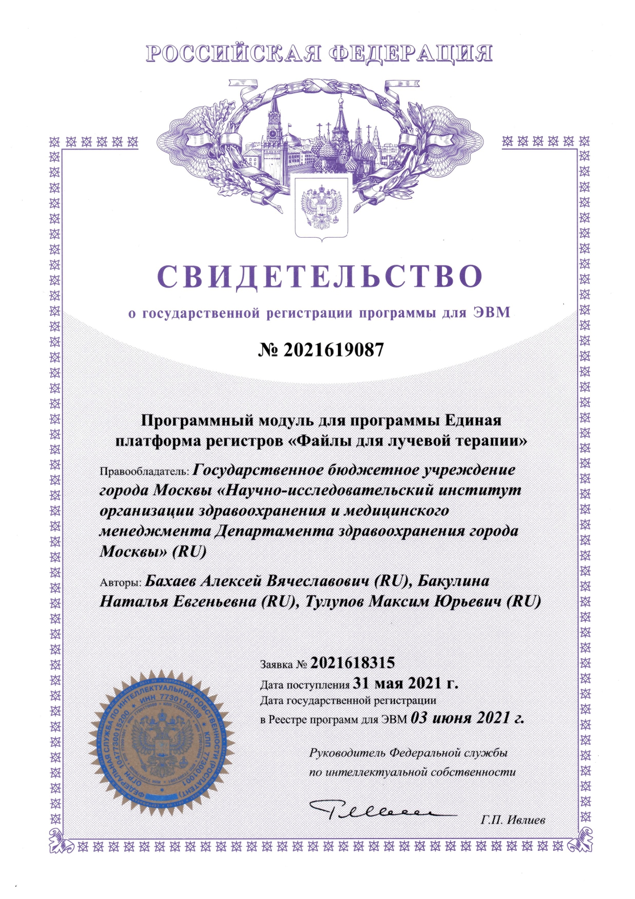 | 4 | Программный модуль для программы Единая платформа регистров «Файлы для лучевой терапии» | ПЭВМ | 2021619087 | 03.06.2021 |