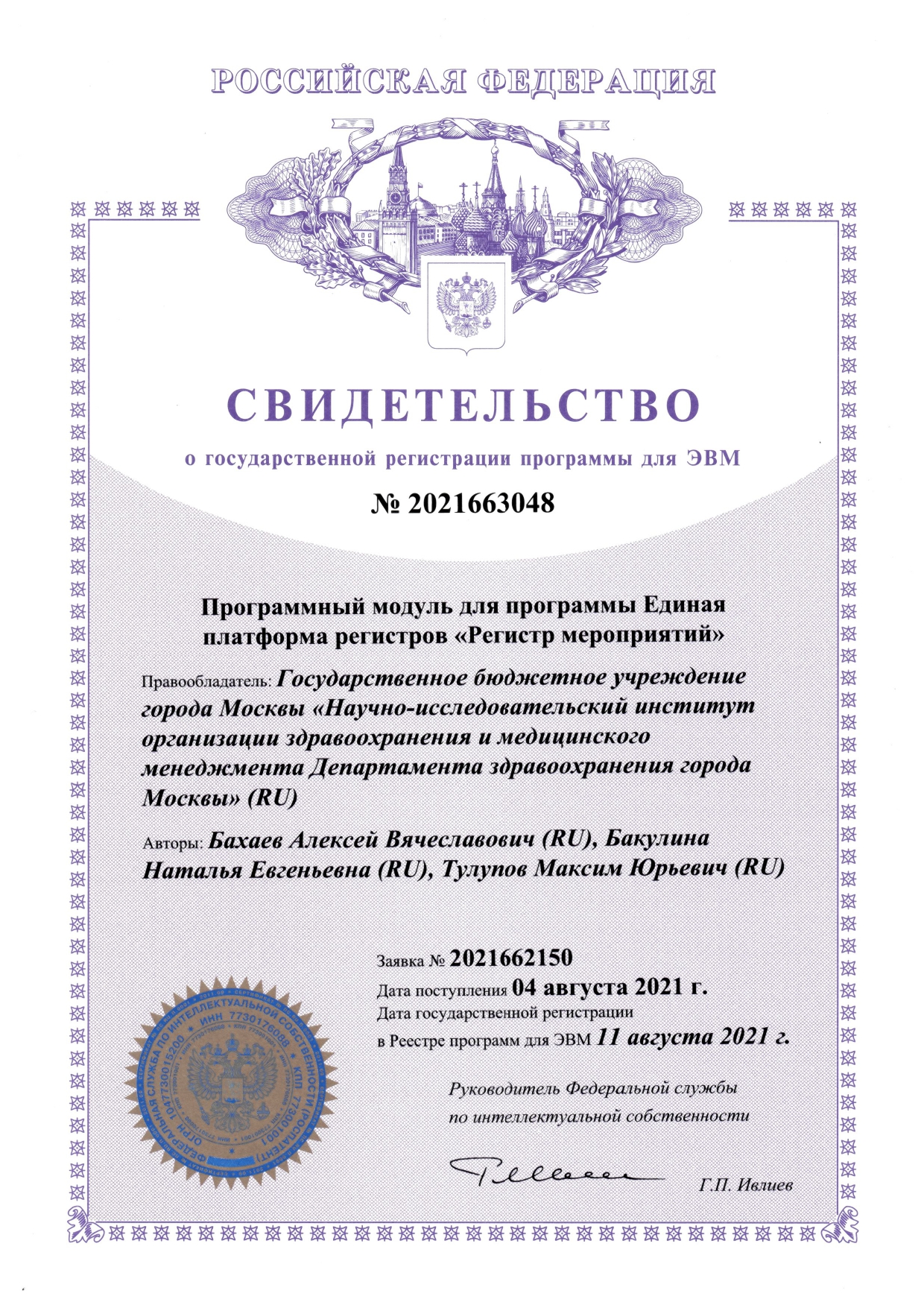 | 25 | Программный модуль для программы Единая платформа регистров «Регистр мероприятий» | ПЭВМ | 2021663048 | 11.08.2021 |