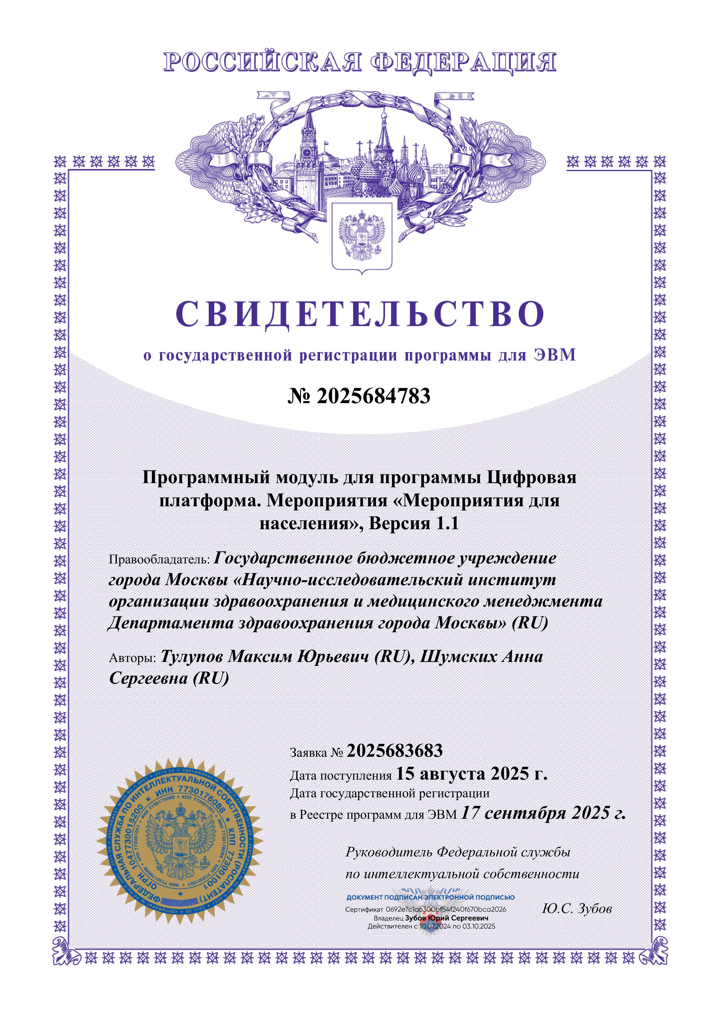 | 206 | Программный модуль для программы Цифровая платформа. Мероприятия «Мероприятия для населения», Версия 1.1 | ПЭВМ | 2025684783 | 17.09.2025 |