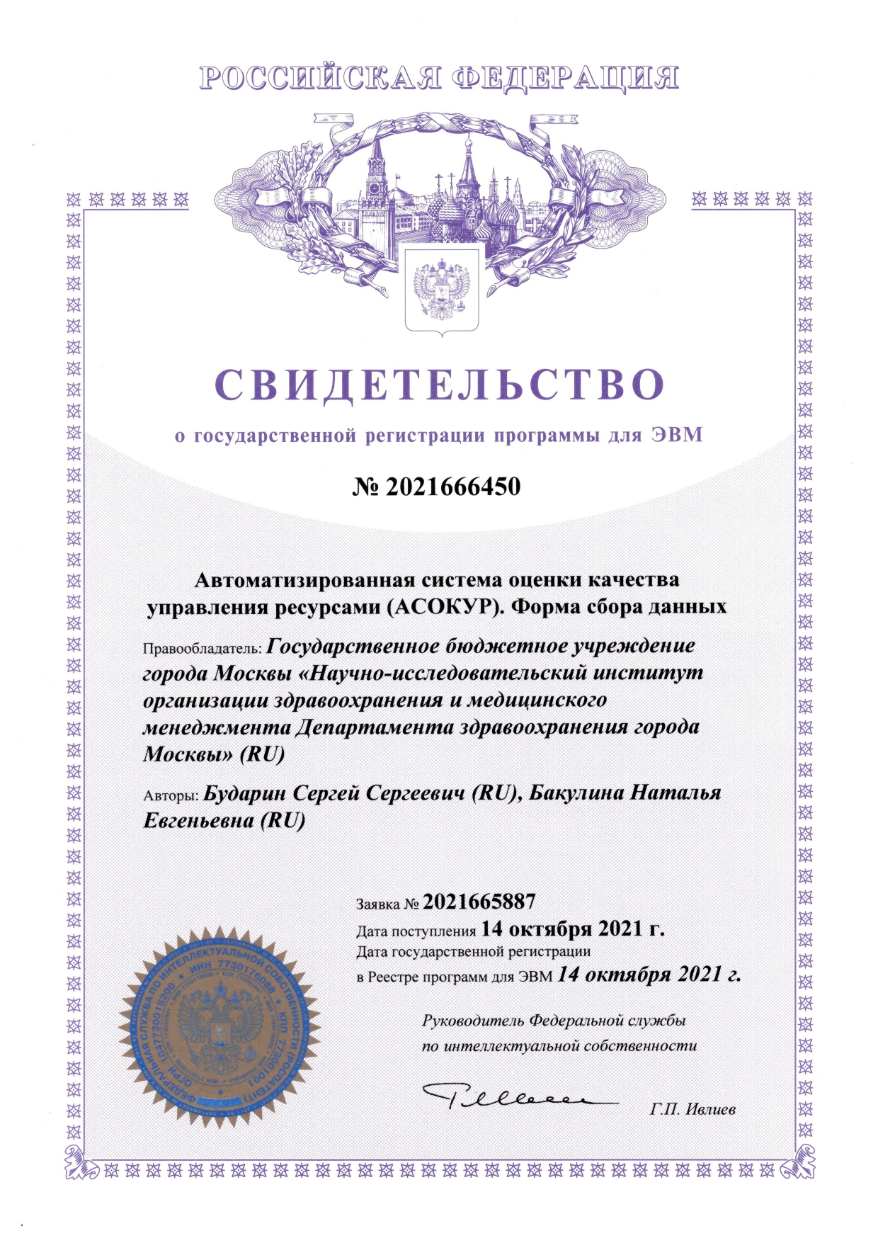 | 31 | Автоматизированная система оценки качества управления ресурсами (АСОКУР) | ПЭВМ | 2021666217 | 11.10.2021 |