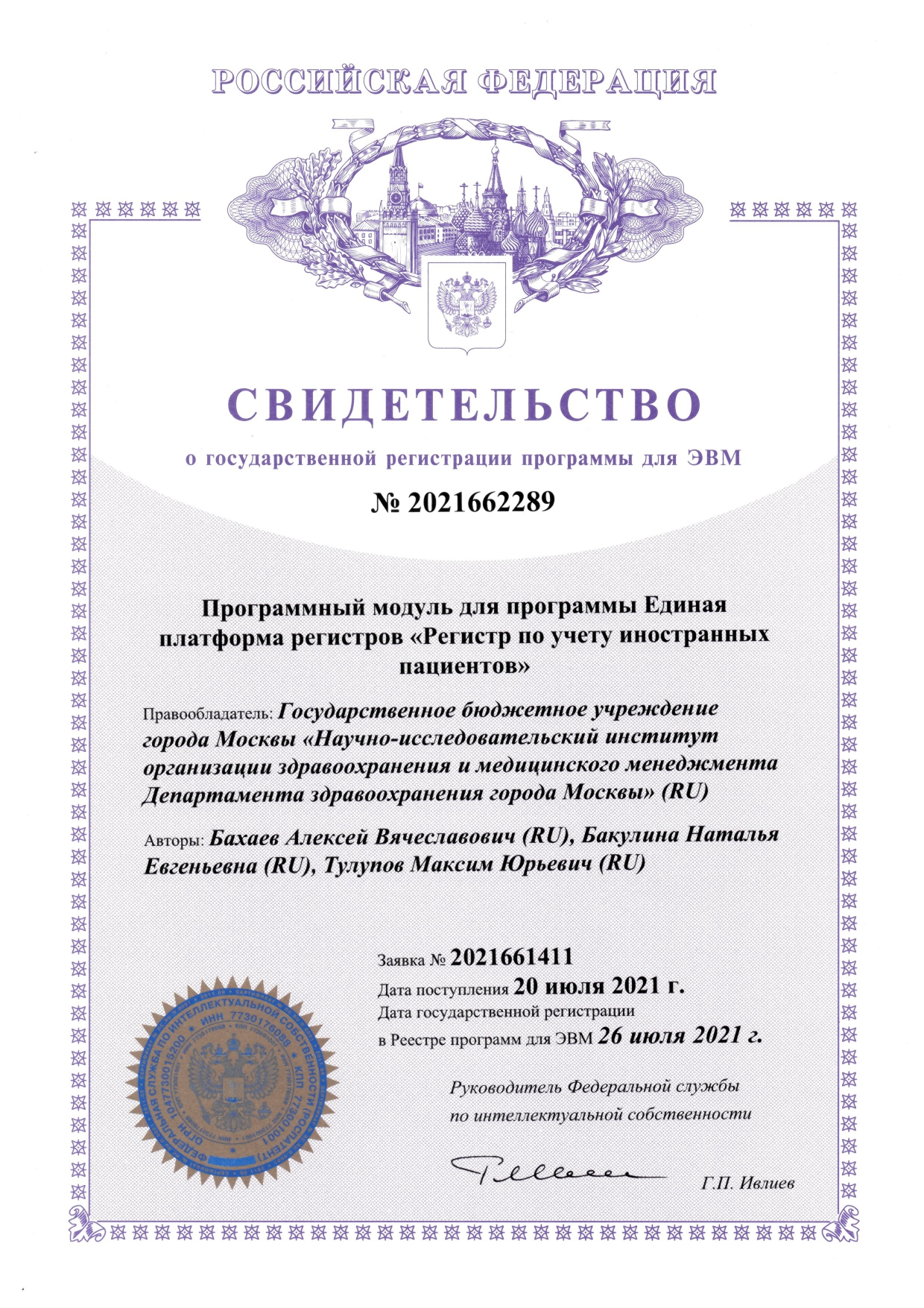 | 16 | Программный модуль для программы Единая платформа регистров «Регистр по учету иностранных пациентов» | ПЭВМ | 2021662289 | 26.07.2021 |