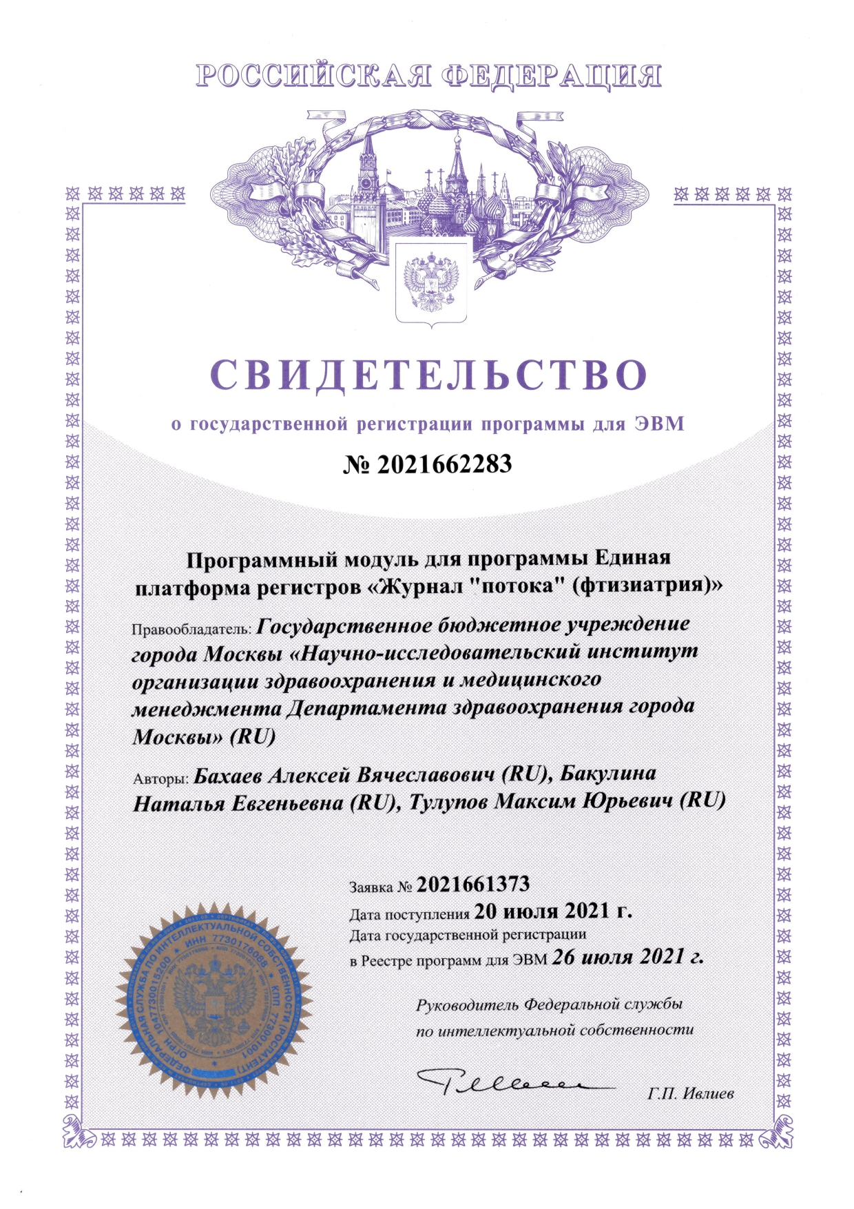 | 19 | Программный модуль для программы Единая платформа регистров «Журнал «потока» (фтизиатрия) | ПЭВМ | 2021662283 | 26.07.2021 |