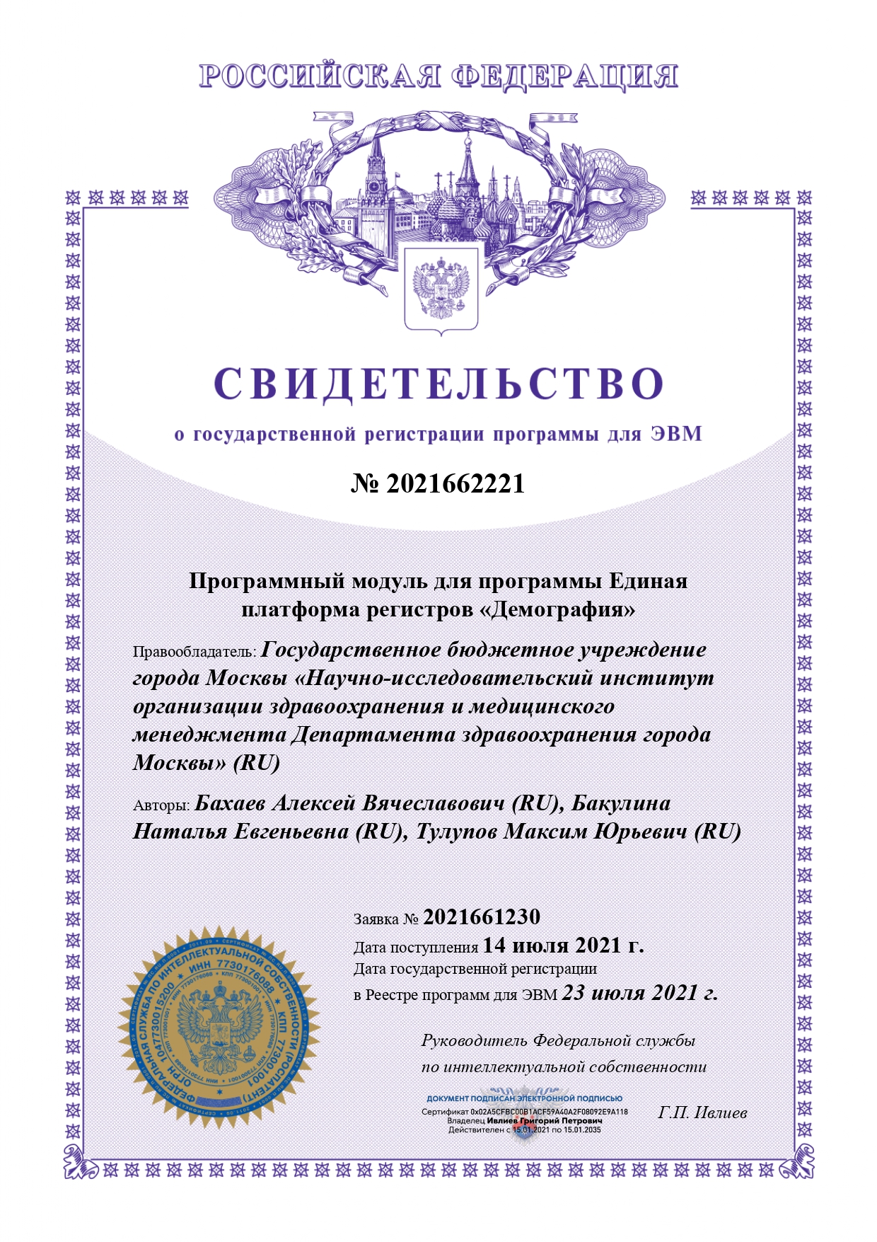 | 15 | Программный модуль для программы Единая платформа регистров «Демография» | ПЭВМ | 2021662221 | 23.07.2021 |