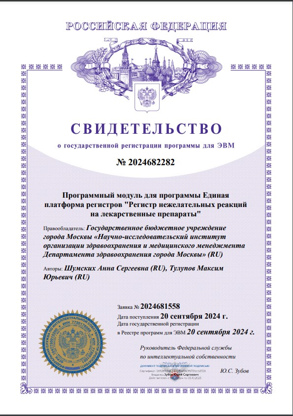 | 11 | Программный модуль для программы Единая платформа регистров «Регистрация нежелательных реакций на лекарственные препараты» | ПЭВМ | 2021662089 | 22.07.2021 |
