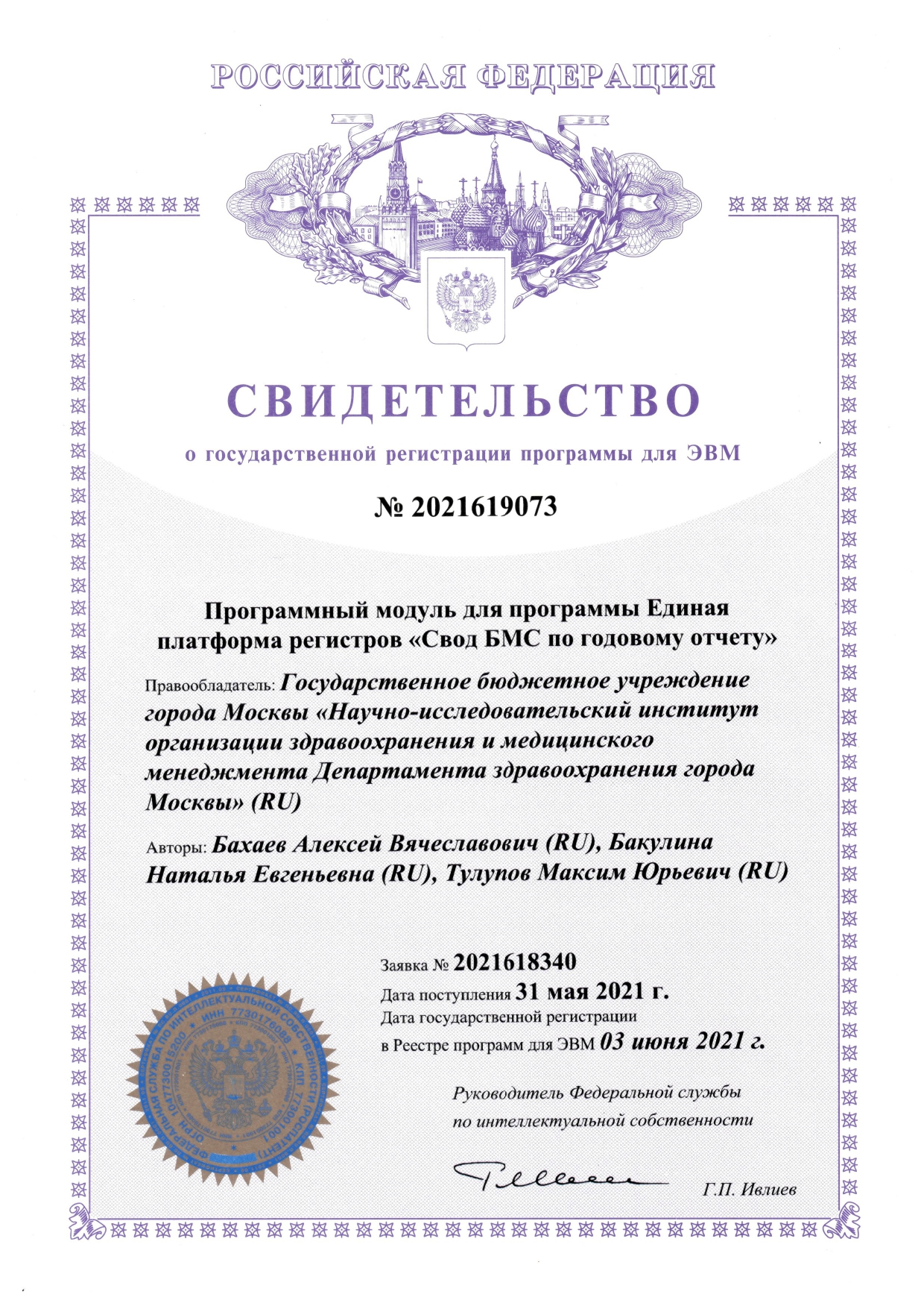 | 3 | Программный модуль для программы Единая платформа регистров «Свод БМС по годовому отчету» | ПЭВМ | 2021619073 | 03.06.2021 |