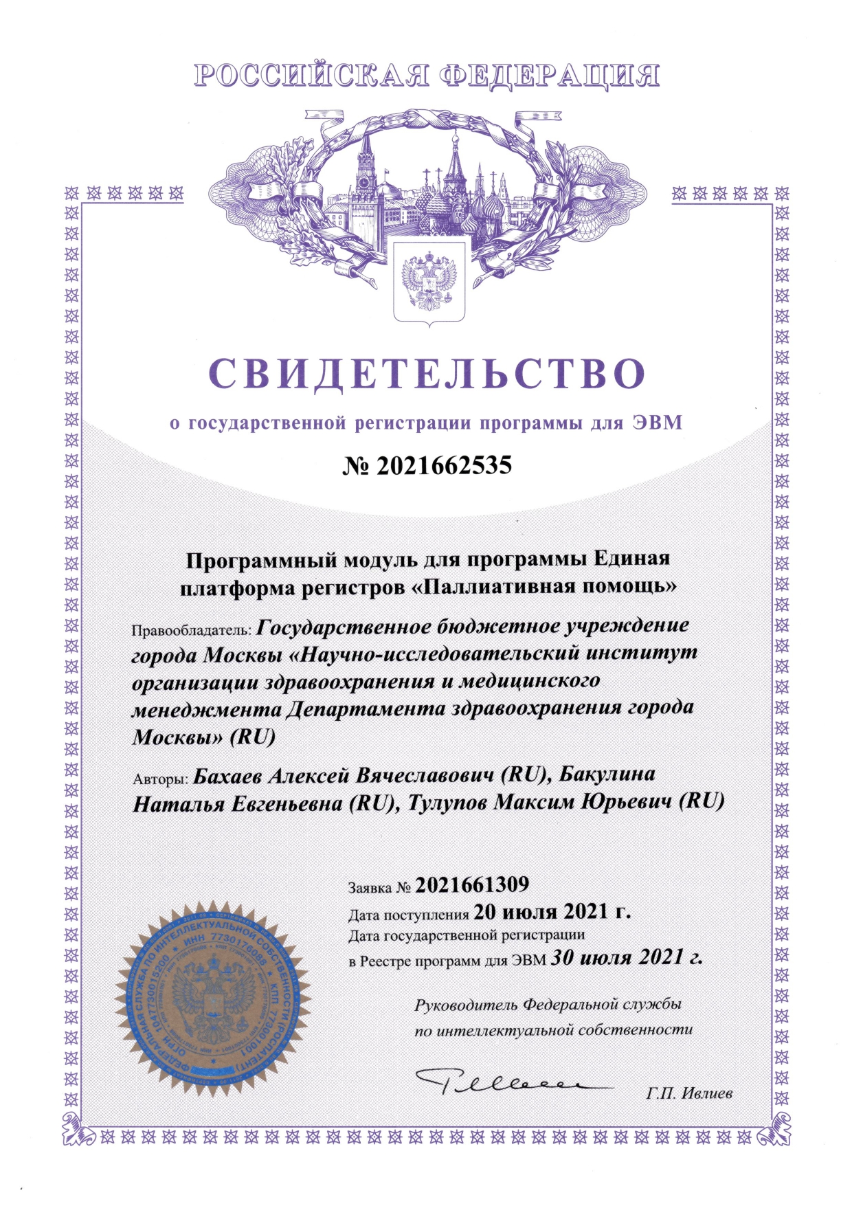 | 23 | Программный модуль для программы Единая платформа регистров «Паллиативная помощь» | ПЭВМ | 2021662535 | 30.07.2021 |