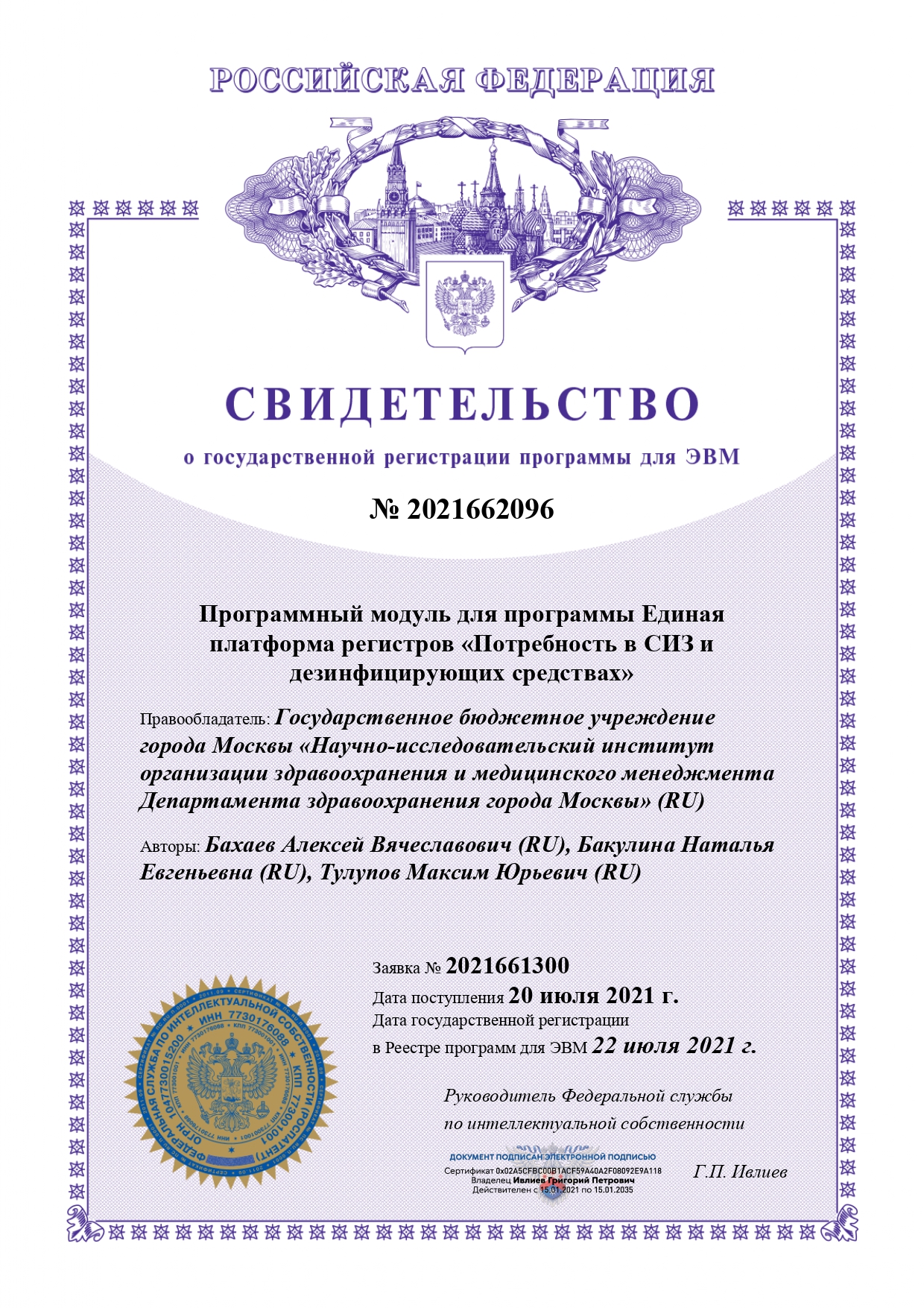 | 13 | Программный модуль для программы Единая платформа регистров «Потребность в СИЗ и дезинфицирующих средствах» | ПЭВМ | 2021662096 | 22.07.2021 |