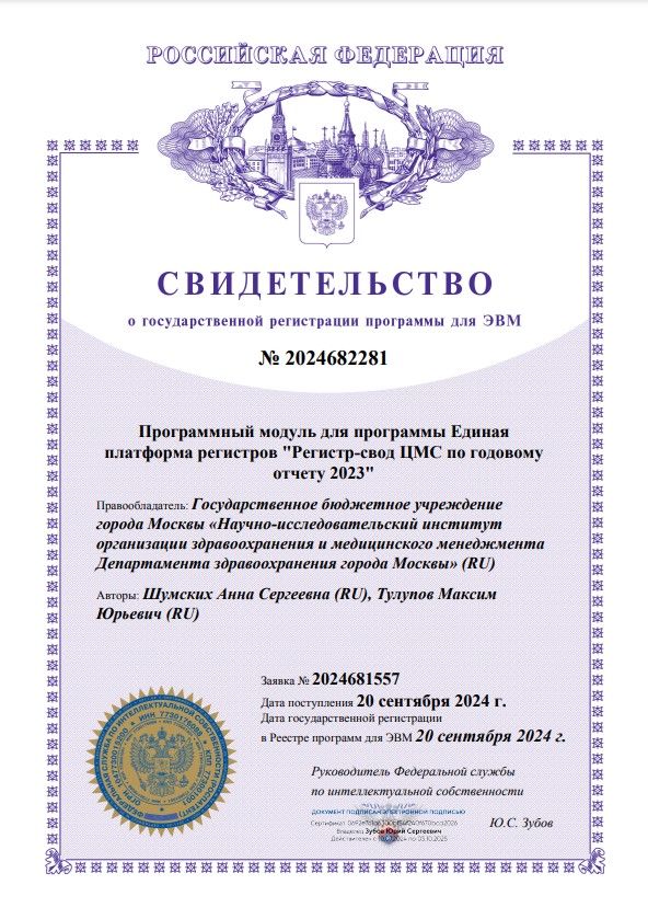| 200 | Информационно-аналитическая система общественного здоровья. НИИОЗММ ДЗМ | ПЭВМ | 2025683586 | 04.09.2025 |