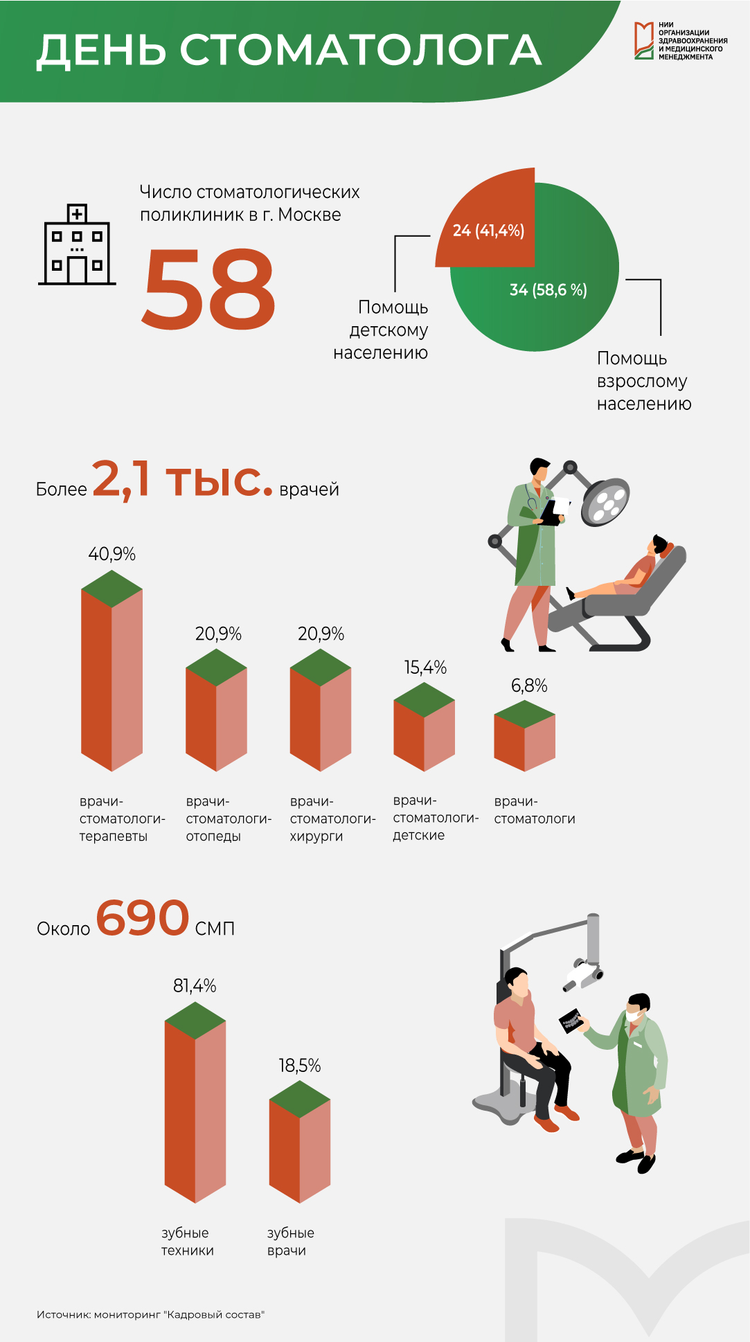 По оценке специалистов Центра медицинской статистики ГБУ «НИИОЗММ ДЗМ», в г. Москве амбулаторно-поликлиническая помощь оказывается населению в 58 стоматологических поликлиниках, подведомственных Департаменту здравоохранения города Москвы, из них в 34 (58,6 %) стоматологических поликлиниках оказывается медицинская помощь взрослому населению и в 24 (41,4 %) детскому населению.