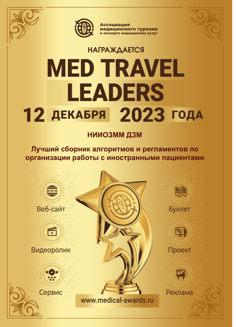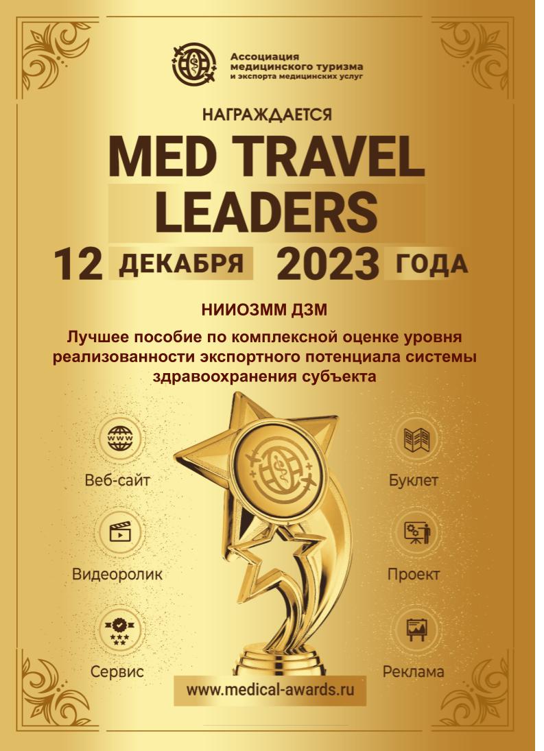 12 декабря 2023 года состоялось подведение итогов IV Всероссийского конкурса по медицинскому туризму и экспорту медицинских услуг Med Travel Leaders – 2023, в котором приняли участие проектные офисы по реализации региональных проектов «Развитие экспорта медицинских услуг» в составе одноименного федерального проекта, представители научных и медицинских организаций. Участники конкурса представили достижения в области медицинского туризма в виде стандартизированных конкурсных заявок, которые были рассмотрены конкурсной комиссией в составе представителей Минздрава России, Министерства экономического развития РФ, Российского экспортного центра.