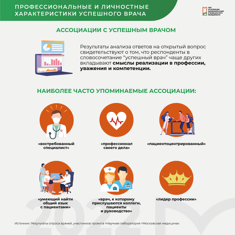 Ассоциации с успешным врачом Результаты анализа ответов на открытый вопрос свидетельствуют о том, что респонденты в словосочетание «успешный врач» чаще других вкладывают смыслы реализации в профессии, уважения и компетенции.